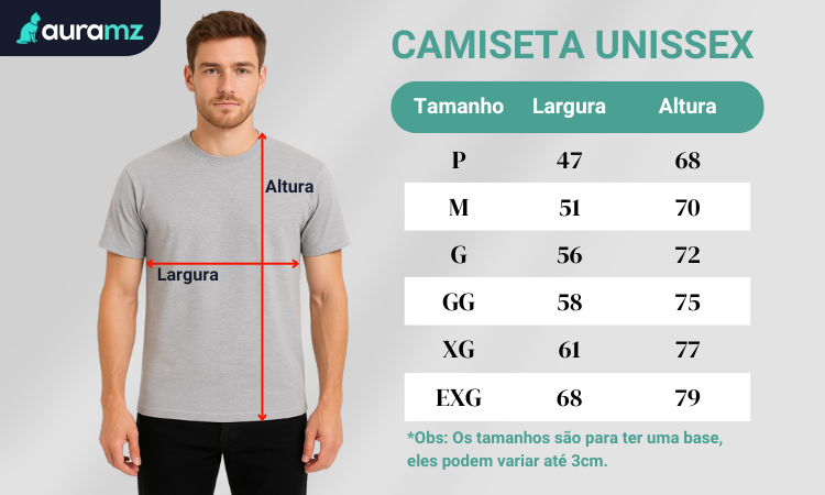 A estampa é aplicada em tecnologia DTF (Direct to Film), reconhecida pela sua alta qualidade e resistência. Com ótima fixação no tecido, mantém as cores vivas e definidas mesmo após várias lavagens, desde que seguidas as orientações de cuidado: lavar do avesso, não usar alvejante e evitar passar ferro diretamente sobre a estampa.
